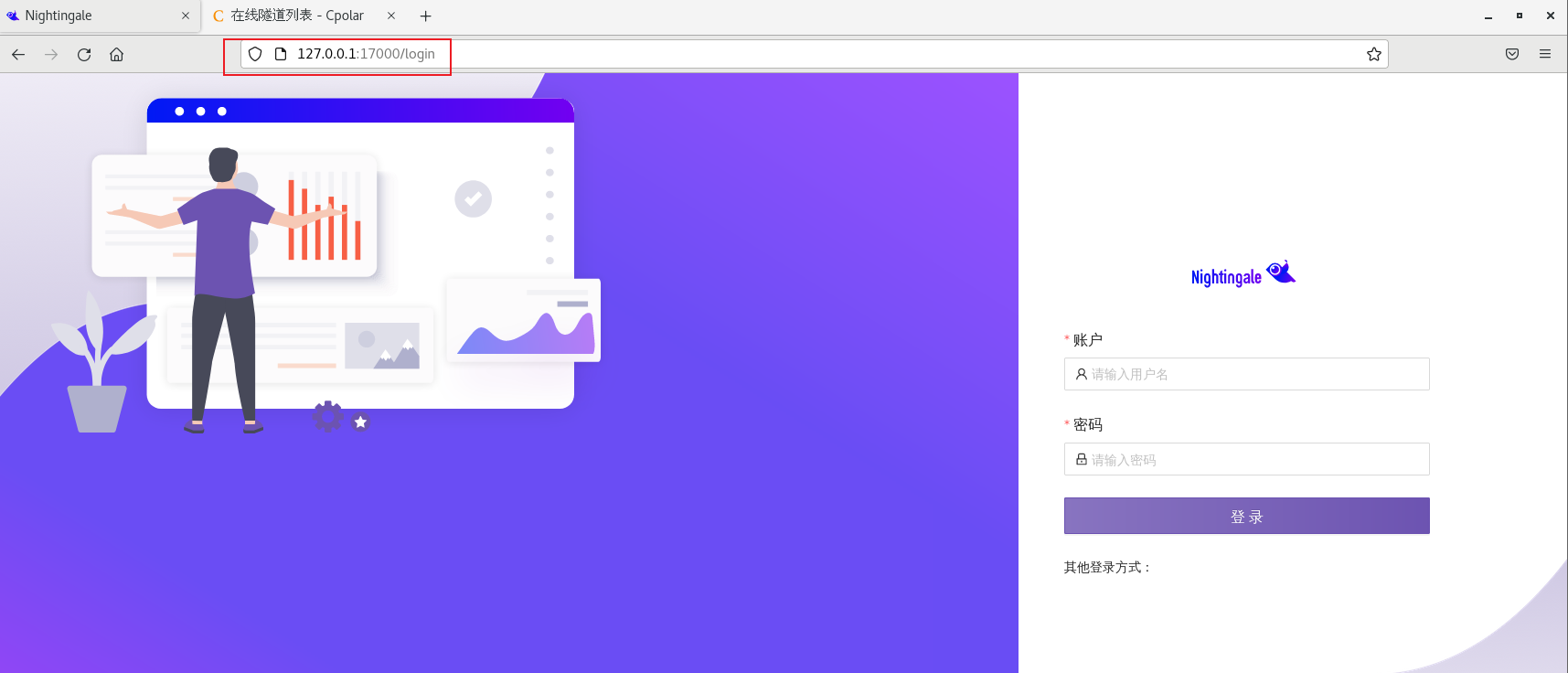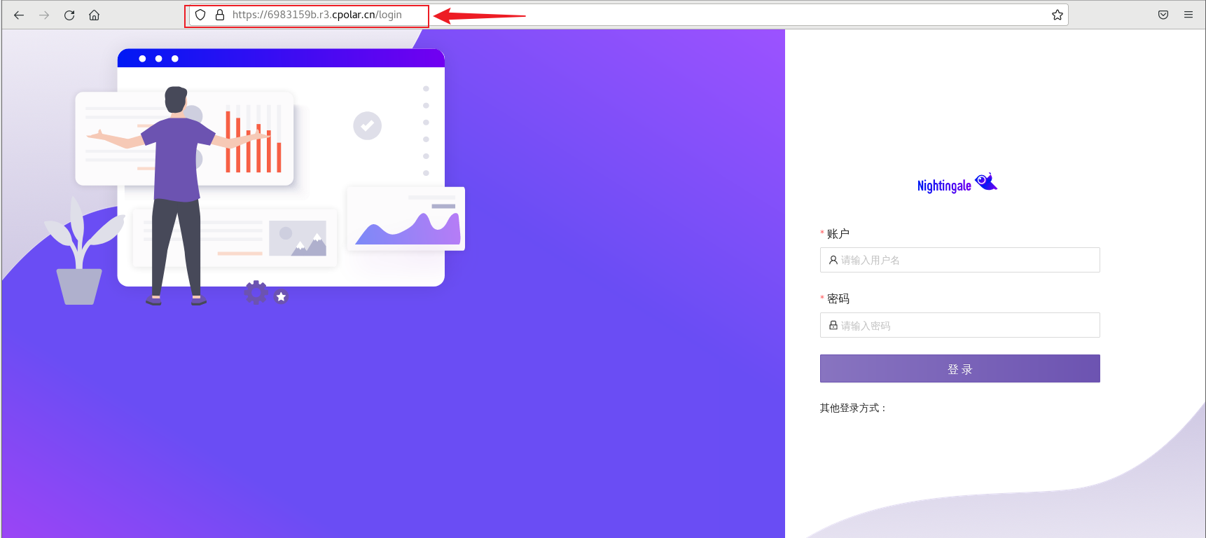 最后,我们使用固定的公网地址访问Nightingale,可以看到访问成功,这样一个固定且永久不变的公网地址就设置好了,新地址访问,可能需要重新登陆