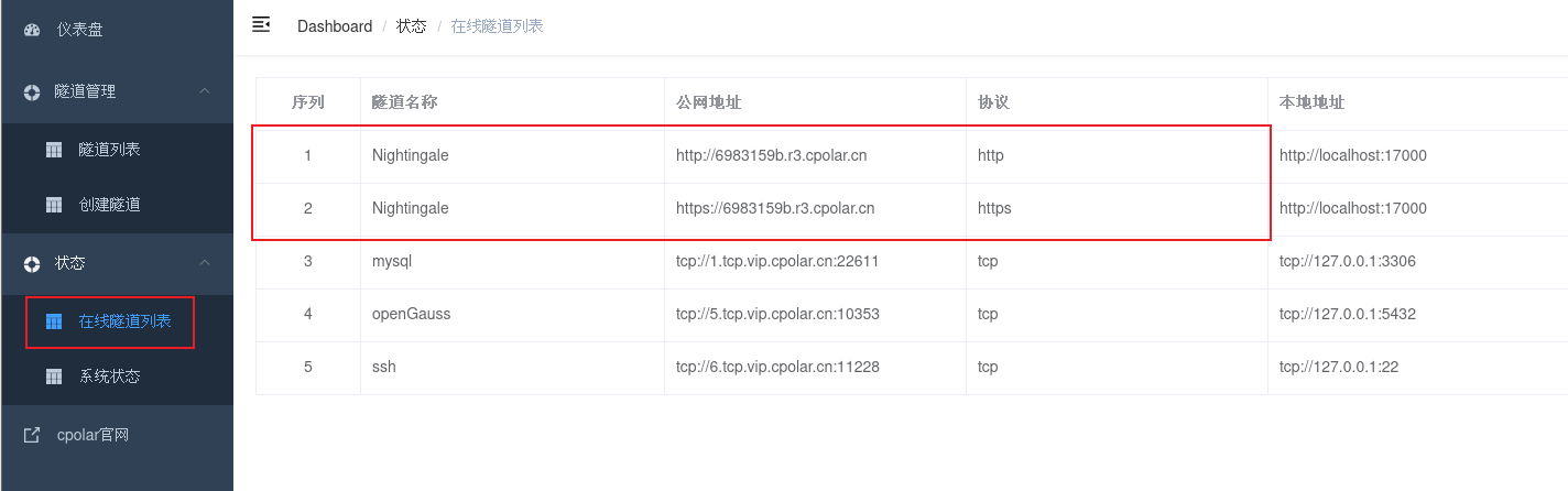 点击左侧仪表盘的隧道管理——创建隧道,创建一个Nightingale的cpolar隧道!