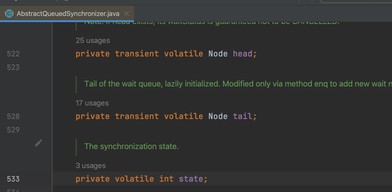 我们直接看源码说原理,AQS队列同步器核心三个变量:head节点、tail节点、state状态码。