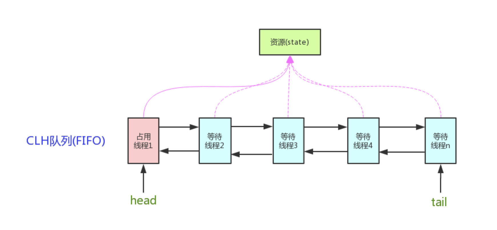 核心原理:队列中的每个节点对应一个线程。线程通过判断state字段进行抢占资源,如果获取资源成功,则把当前线程设置为有效工作线程,并且修改state值。其他竞争失败线程,就阻塞进入FIFO队列,等待持有锁线程按顺序唤醒。