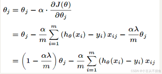 L1的梯度: 🍼 𝐿=𝐿(𝑊)+ \lambda*\sum_{i=1}^{n}\lvert w_i\rvert 🍼 \frac{\partial L}{\partial w{i}} = \frac{\partial L(W)}{\partial w{i}}+\lambda sign(w_{i}) 🍼 w_i = w_i - \alpha \frac{\partial L(W)}{\partial w_{i}} - \alpha 2\lambda w_i