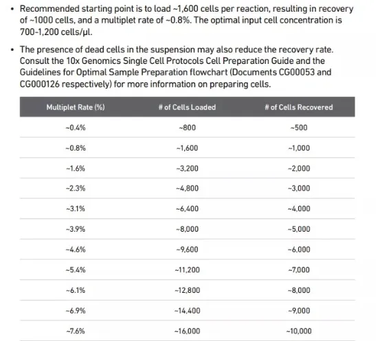 下面的表格是DoubletRate参数选择的参考文件(10X),在分析之前参照这个表格上边的细胞数选择DoubletRate值。