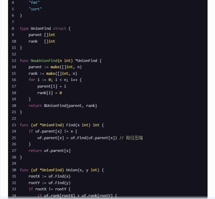 }这段代码实现了Kruskal算法,通过创建UnionFind结构用于并查集操作,并根据边权重对边进行排序和最小生成树构建。