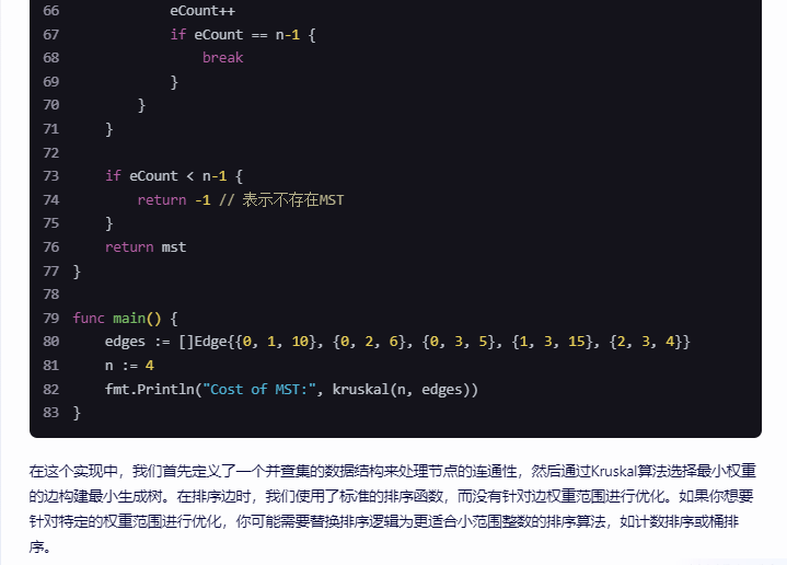 }这段代码定义了一个边结构体 Edge 和一个并查集结构体 UnionFind,用于实现Kruskal算法。Edges 类型实现了 heap.Interface,用于管理边的集合。Kruskal 函数实现了算法的核心逻辑。在 main 函数中,我们创建了一个示例图并调用 Kruskal 函数来找到最小生成树。