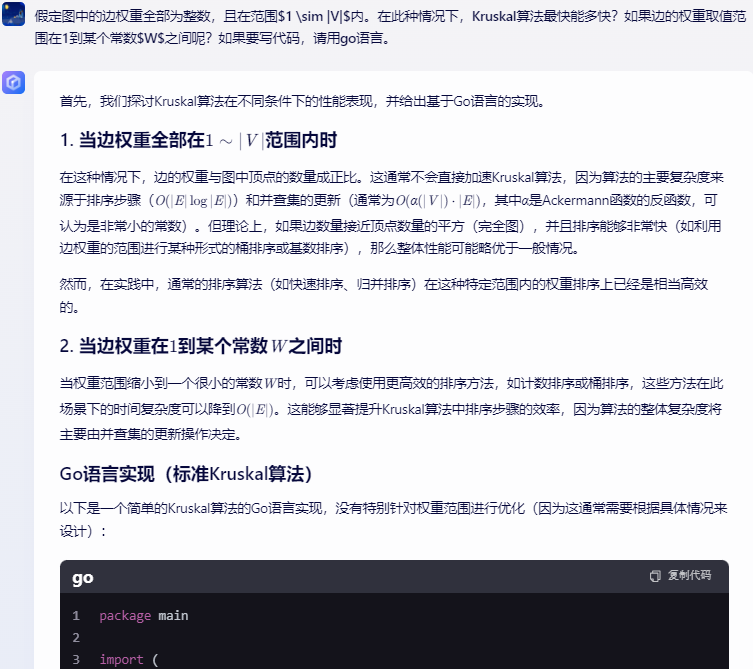 四、假定图中的边权重全部为整数,且在范围$1 \sim |V|$内。在此种情况下,Kruskal算法最快能多快?如果边的权重取值范围在1到某个常数$W$之间呢?如果要写代码,请用go语言。