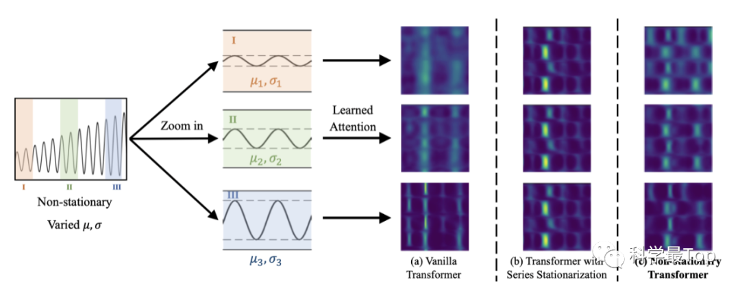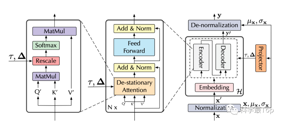 但是,仅通过以上步骤显然并不能完全恢复原始序列的非平稳性。举例来说,不同的时间序列是可以生成相同的平稳化输入 。然后,模型会得到相同的注意力权重,这样就无法捕捉与非平稳性纠缠在一起的重要时间依赖关系。换句话说,由过度平稳化引起的削弱效应发生在深度模型内部,特别是在注意力计算中。