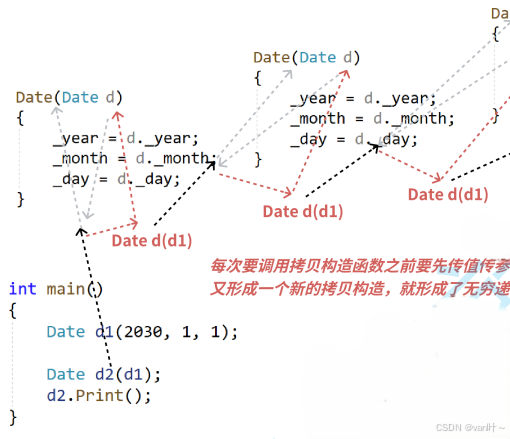 所以拷⻉构造函数的第⼀个参数必须是类类型对象的引⽤(!!!!!!!!!!!!)