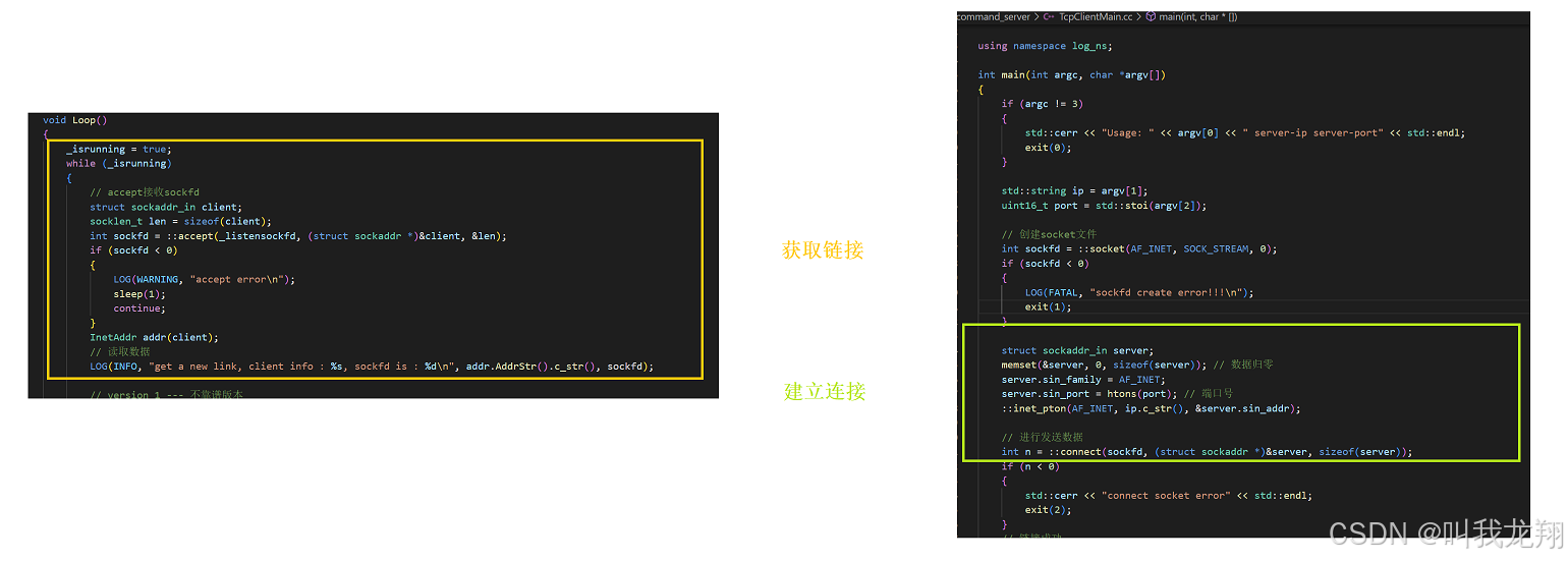 }注意添加具体的参数,让操作更加顺畅! 然后就是加入获取链接与进行链接,这也可以从之前的服务器端和客户端代码中拆分出来,之后服务端和客户端只需要调用对应的接口即可,非常方便 !!!