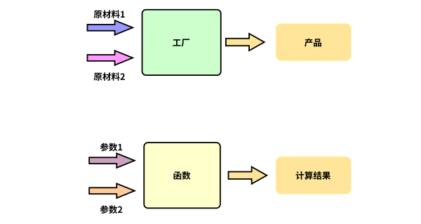 我们可以把函数想象成小型的⼀个加工厂,工厂得输入原材料,经过工厂加工才能生产出产品,那函数也是⼀样的,函数⼀般会输入⼀些值(可以是0个,也可以是多个),经过函数内的计算,得出结果。