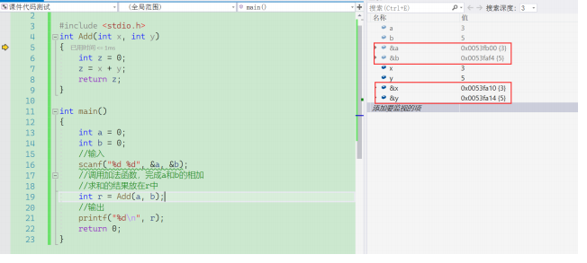 1 # include <stdio.h> 2int Add ( int x, int y) 3{ 4 int z = 0 ; 5 z = x+y; 6 return z; 7} 8int main () 9{ 10 int a = 0 ; 11 int b = 0 ; 12 //输⼊ 13 scanf ( "%d %d" , &a, &b); 14 //调⽤加法函数,完成 a和b的相加 15 //求和的结果放在 r 中 16 int r = Add(a, b); 17 //输出 18 printf ( "%d\n" , r); 19 return 0 ; 20}
