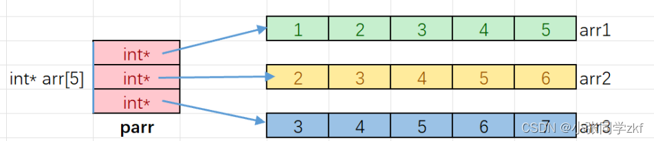 parr[i]是访问parr数组的元素,parr[i]找到的数组元素指向了整型一维数组,parr[i][j]就是整型一维数组中的元素。 上述的代码模拟出二维数组的效果,实际上并非完全是二维数组,因为每一行并非是连续的。