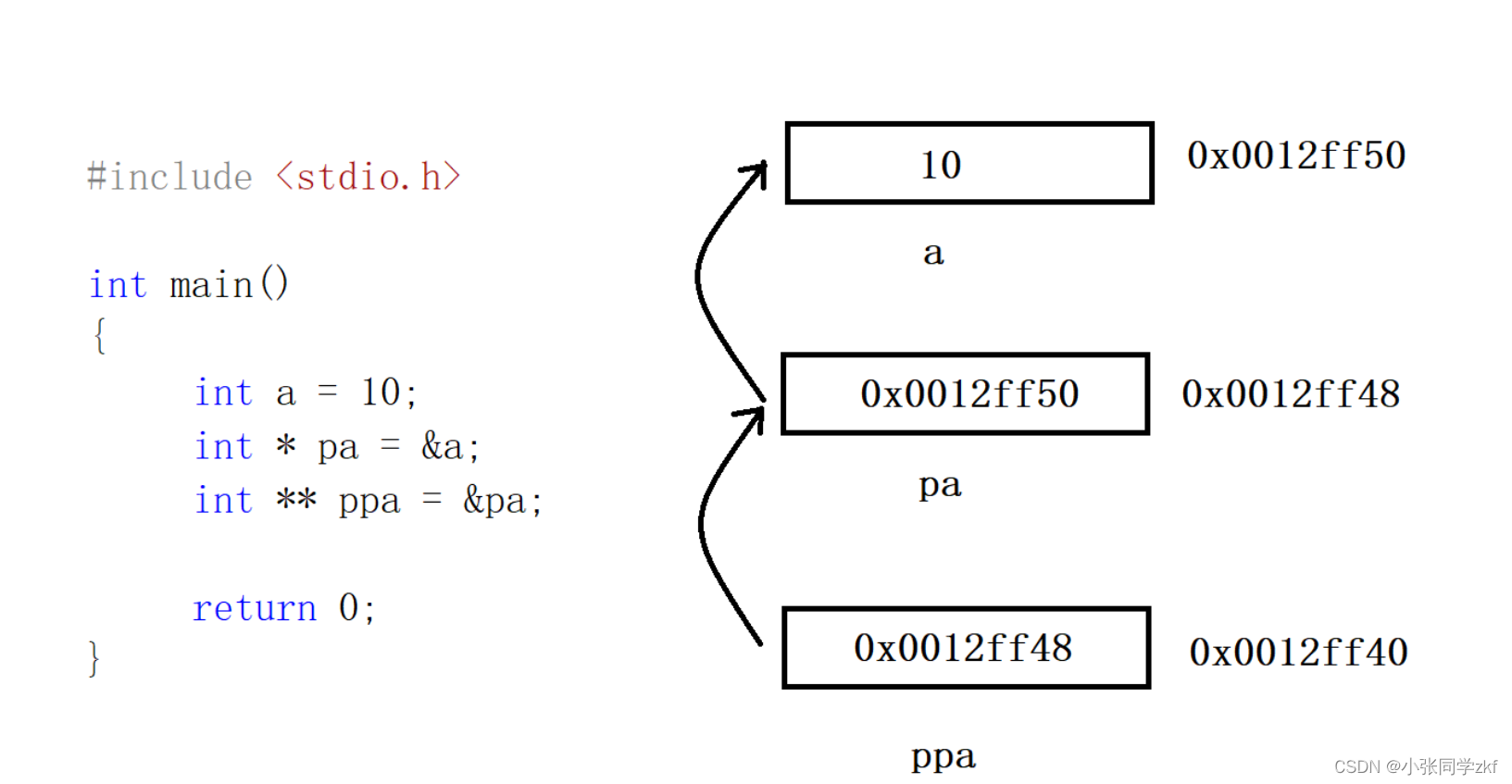 }指针变量也是变量,是变量就有地址,那指针变量的地址存放在哪里? 存放在二级指针