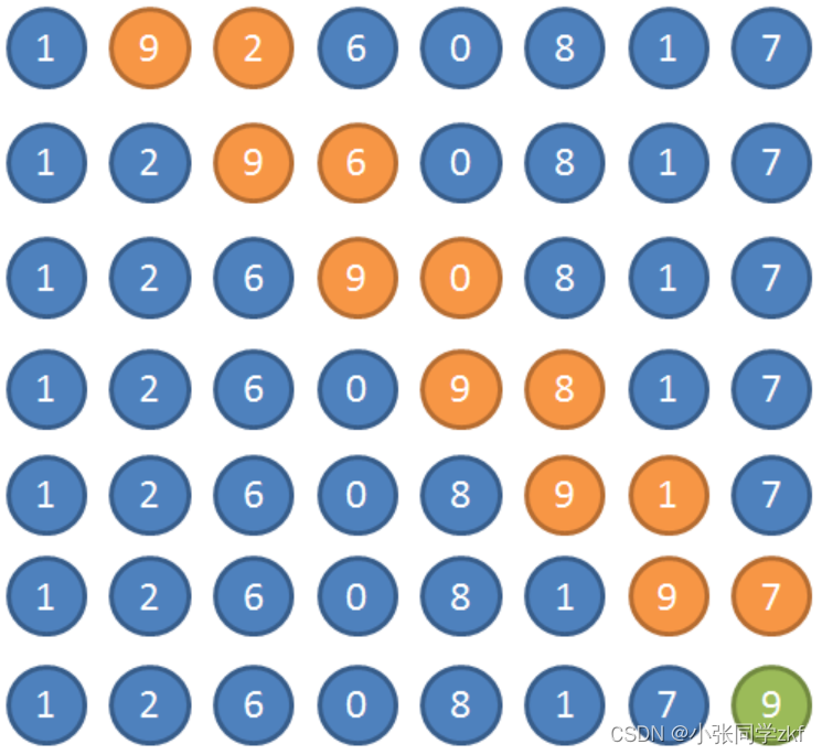冒泡排序的核心思想就是:两两相邻的元素进行比较,比较完进行下一趟数的比较,直到最后一个数比较完。