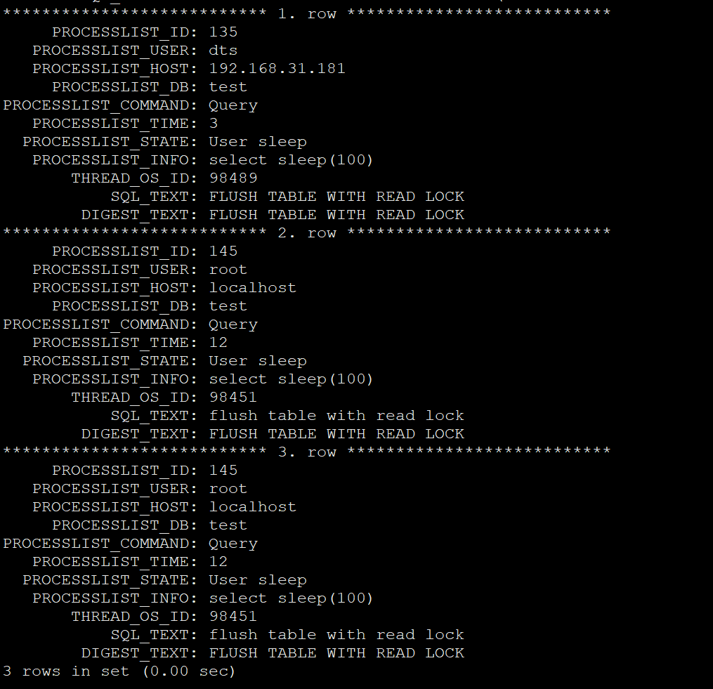 | 135 | dts | 192.168.31.181:52902 | test | Query | 517 | Waiting for global read lock | delete from tb2 | 517124 | 3 | 3 |