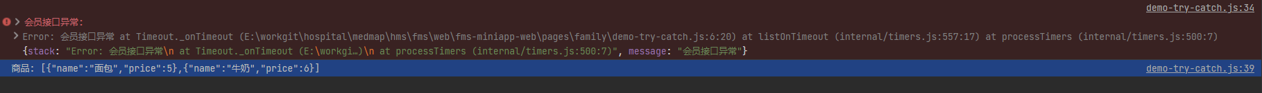 此处同上模拟前端调用后端两个接口,此时会员信息接口出现问题异常,商品信息接口正常。 小伙伴们可以看到,此时就掉入没有捕获异常的的坑了,非常遗憾,后续牵连接口一并因错误戛然而止,出错连坐!