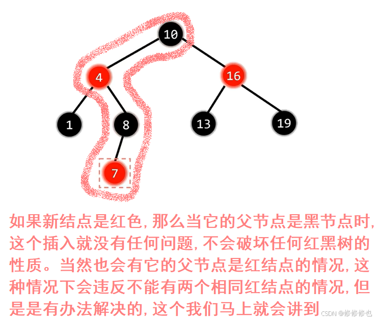 我们可以看到,如果插入的红结点父亲是黑节点,那么红结点的插入就不会破坏任何红黑树的规则, 这就相当于同辈人没有直接结婚生子,而只是谈了一个男/女朋友,并不会真正影响到平衡的格局, 只是偶尔会遇到父节点也是红结点的情况,这个时候我们按后面学到的处理方法将他们处理一下就可以.