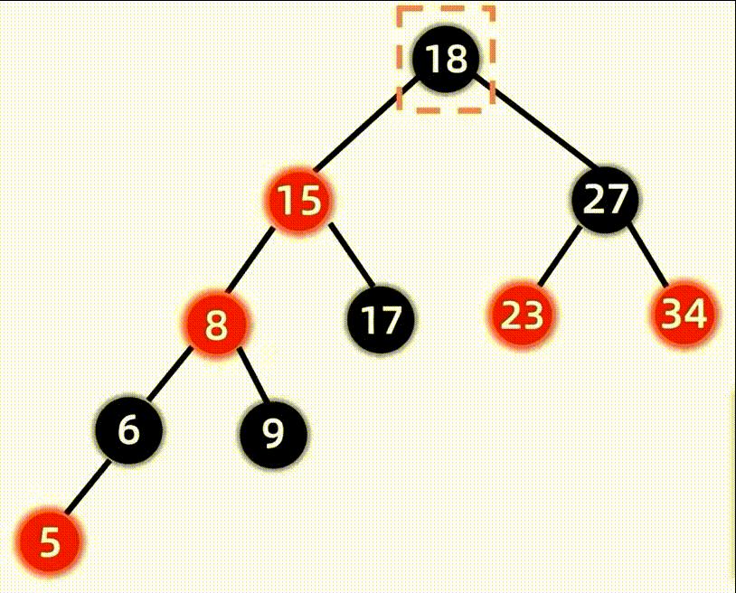 然后继续将爷爷结点18作为新插入结点继续向上判定,发现他不符合根结点是黑色结点的性质,因此我们将根节点18变为黑色即可: