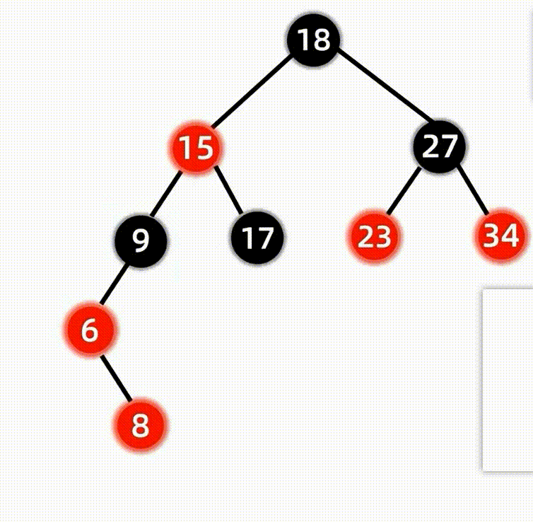 变色完成后,我们继续判断爷爷结点8是否有违反红黑树的性质,发现结点8和其父亲结点15违反了不能有两个连续红结点的性质,同时其叔叔结点27是黑色,通过观察是LL型旋转,因此我们选择右旋来解决这个问题: