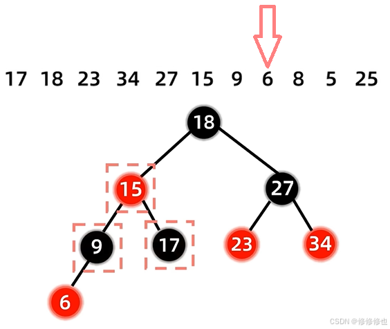 发现新插入的6和其父亲结点9违反了不能有两个连续红结点的性质,同时其叔叔是红色,因此我们选择将父亲结点叔叔结点和爷爷结点变色来解决这个问题: