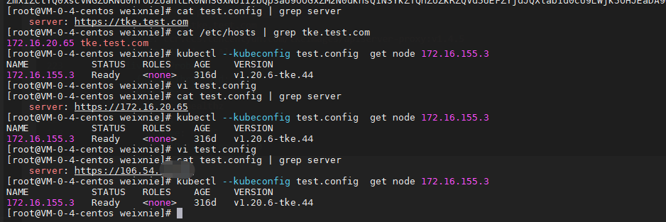 替换第5步获取kubeconfig的server地址,可以用内网clb的vip,eip,也可以是域名,下面我们测试下