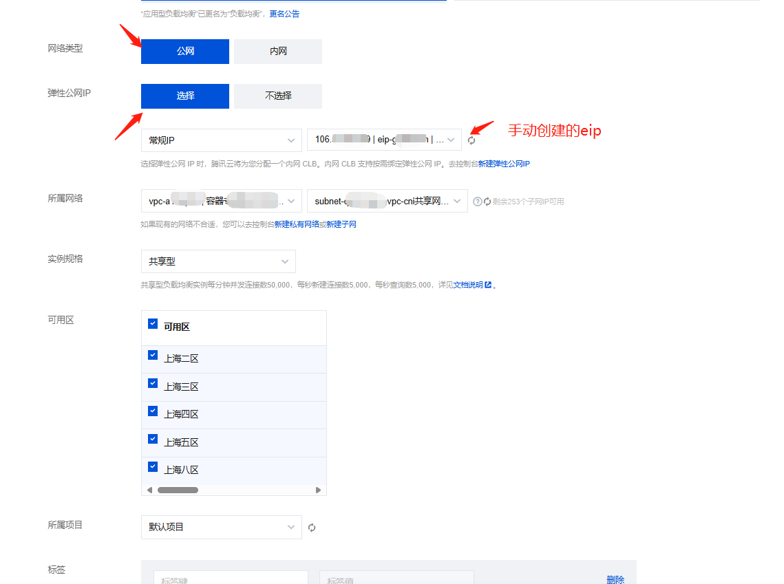 这里弹性公网ip选择第一步创建的eip,如果要限制公网的访问,直接在公网clb绑定安全组,参考文档https://cloud.tencent.com/document/product/214/14733