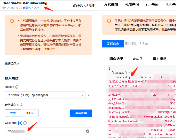 service.kubernetes.io/tke-existed-lbid: lb-xxxxxx如果不是控制台开启的apiserver访问,控制台是不提供kubeconfig的,但是我们可以通过接口DescribeClusterKubeconfig
