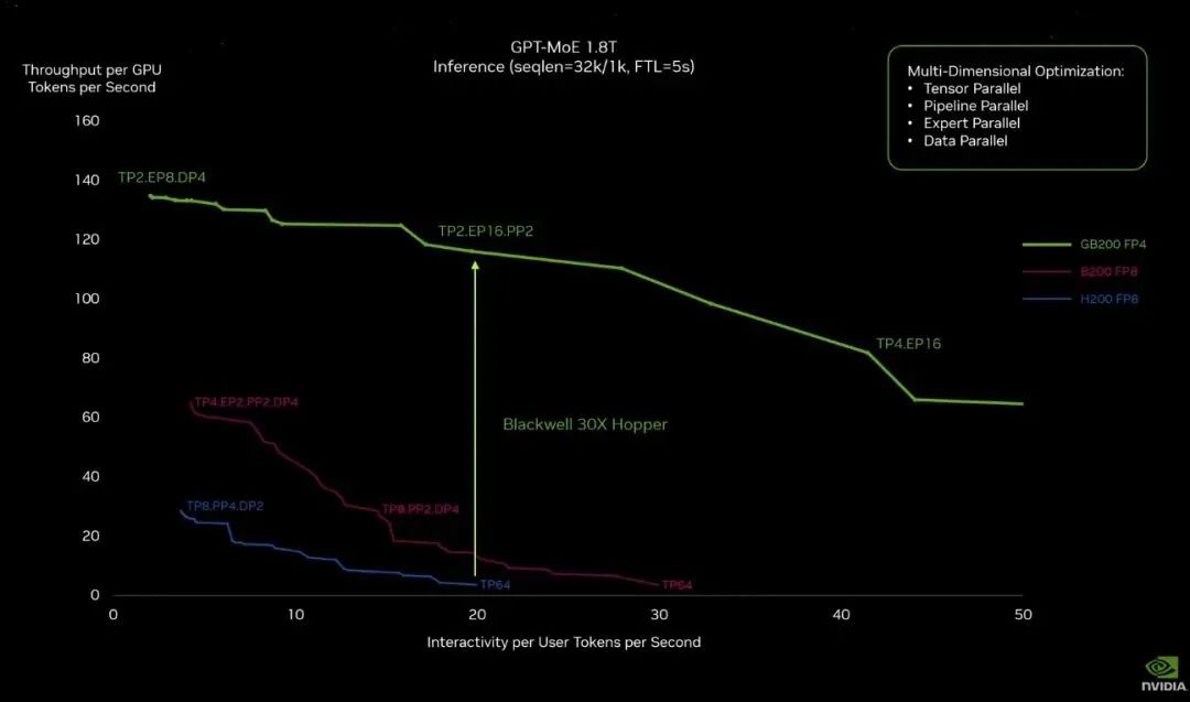 如果使用Blackwell GPU,只需要2000张,同样跑90天只要消耗四分之一的电力。同时生成Token的成本也会随之降低。