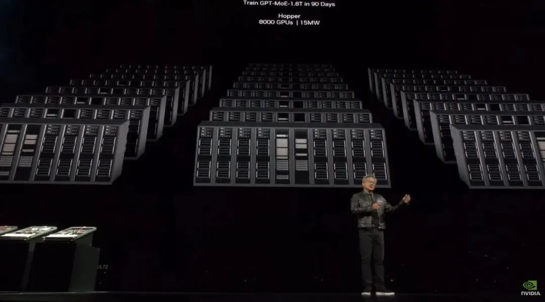 GB200新系统提升体现在,要训练一个1.8万亿参数量的GPT模型,需要8000张Hopper GPU,消耗15兆瓦的电力,连续跑上90天。