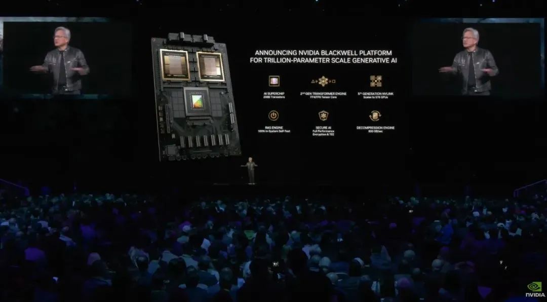 老黄展示Grace-Blackwell平台(两个Blackwell GPU、四个die与一个Grace Cpu连接在一起)。