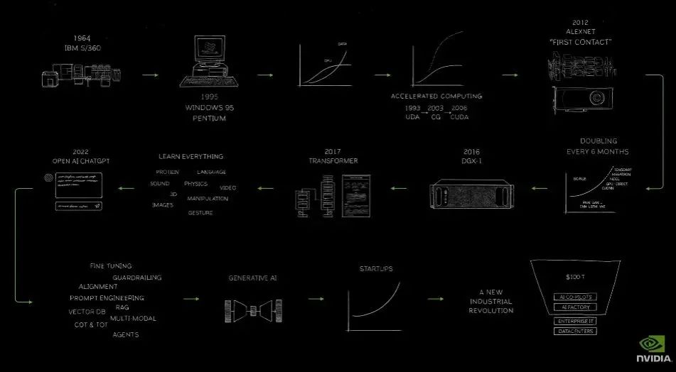 2016 年,发明了一种全新类型的计算机,我们称之为 DGX1,170 teraflops,八个 GPU 首次连接在一起,交付了第一台 DGX1 给一家位于旧金山的初创公司,名为 OpenAI。