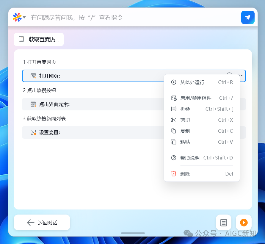 实在 Agent(智能体)能够规划任务执行步骤 ,并生成包含执行逻辑的RPA代码组件,自动执行任务流程,使规划的步骤能够按部就班有效运行。