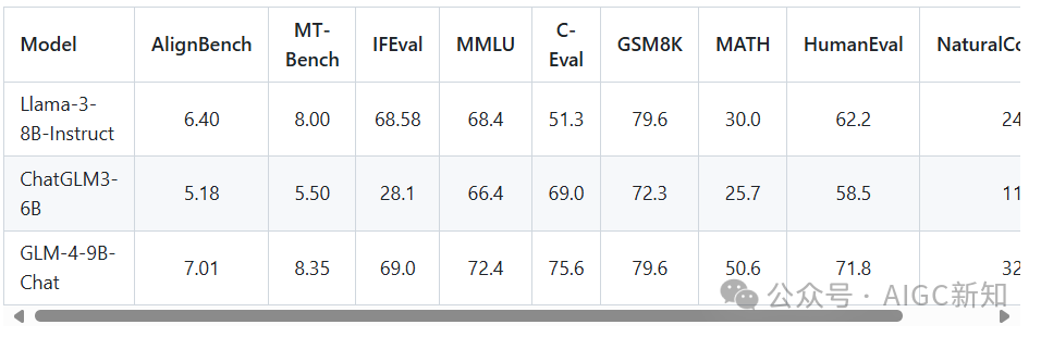 在语义理解、数学计算、逻辑推理、编程代码以及综合知识等多个领域的数据集评估中,GLM-4-9B及其针对人类偏好优化的版本GLM-4-9B-Chat均展现出超越Llama-3-8B的优异性能。