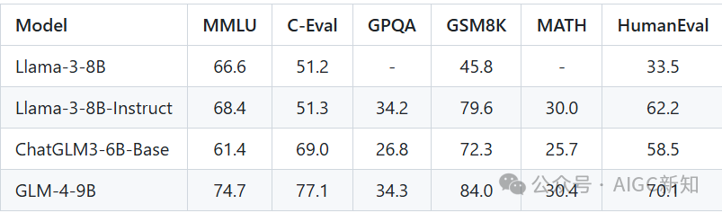 由于 GLM-4-9B 在预训练过程中加入了部分数学、推理、代码相关的 instruction 数据,所以将 Llama-3-8B-Instruct 也列入比较范围。
