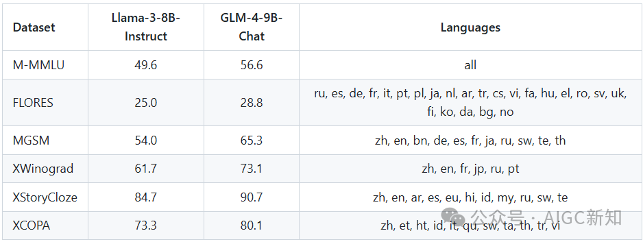 在六个多语言数据集上对 GLM-4-9B-Chat 和 Llama-3-8B-Instruct 进行了测试,测试结果及数据集对应选取语言如下表