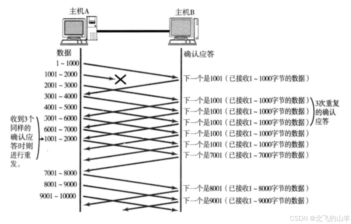 假设是1001到2000这一段报文丢了, 1001到2000后续的被对方收到的报文所返回的ACK报文中的确认序号会一直是1001,告诉我是1001开始的这一段报文丢了,要进行重发。