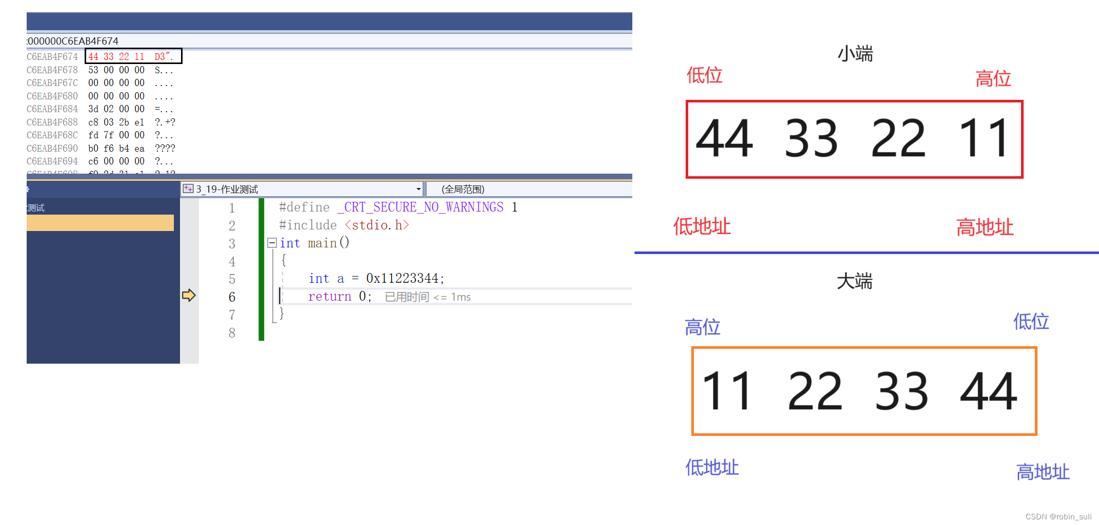 1.其实超过⼀个字节的数据在内存中存储的时候,就有存储顺序的问题,按照不同的存储顺序,我们分为⼤端字节序存储和⼩端字节序存储。⼤端(存储)模式:是指数据的低位字节内容保存在内存的⾼地址处,⽽数据的⾼位字节内容,保存在内存的低地址处。⼩端(存储)模式:是指数据的低位字节内容保存在内存的低地址处,⽽数据的⾼位字节内容,保存在内存的⾼地址处。这里有一个相关练习