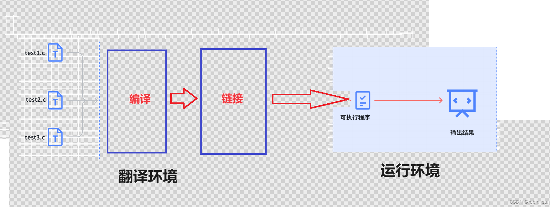 1.翻译环境和运行环境:在ANSI C的任何⼀种实现中,存在两个不同的环境。第1种是翻译环境,在这个环境中源代码被转换为可执⾏的机器指令(⼆进制指令) 第2种是执行环境,它用于实际执行代码。具体可以参考这个图来加深理解。