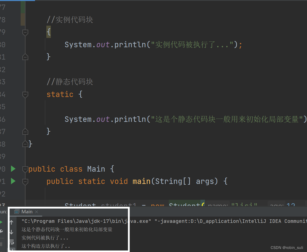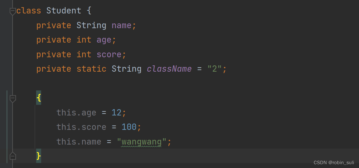 注意:静态成员变量一般不会放在构造方法中来初始化,构造方法中初始化的是与对象相关的实例属性 静态成员变量的初始化分为两种:就地初始化 和 静态代码块初始化(后面马上讲到) 。