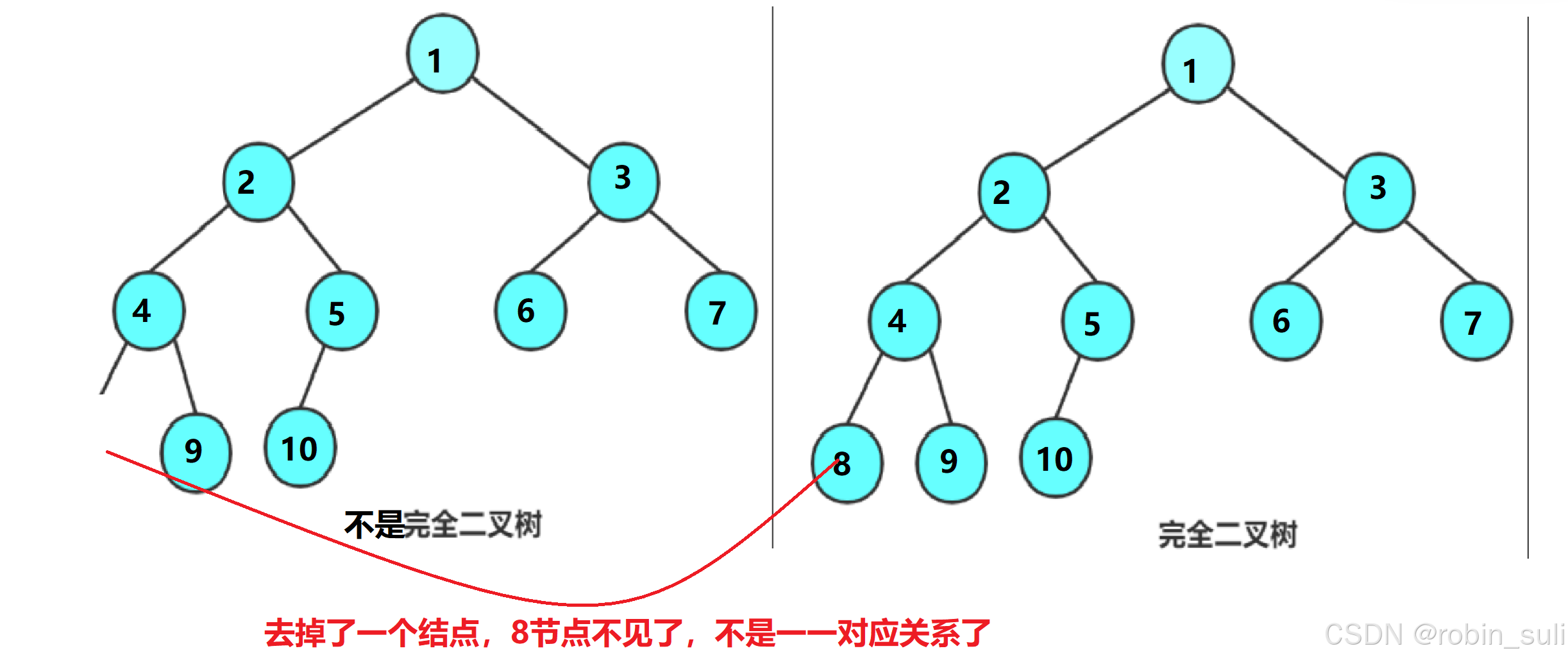 完全二叉树是效率很高的数据结构,完全二叉树是由满二叉树而引出来的。对于深度为K的,有n 个结点的二叉树,当且仅当其每一个结点都与深度为K的满二叉树中编号从0至n-1的结点一一对应时称之为 完全二叉树。