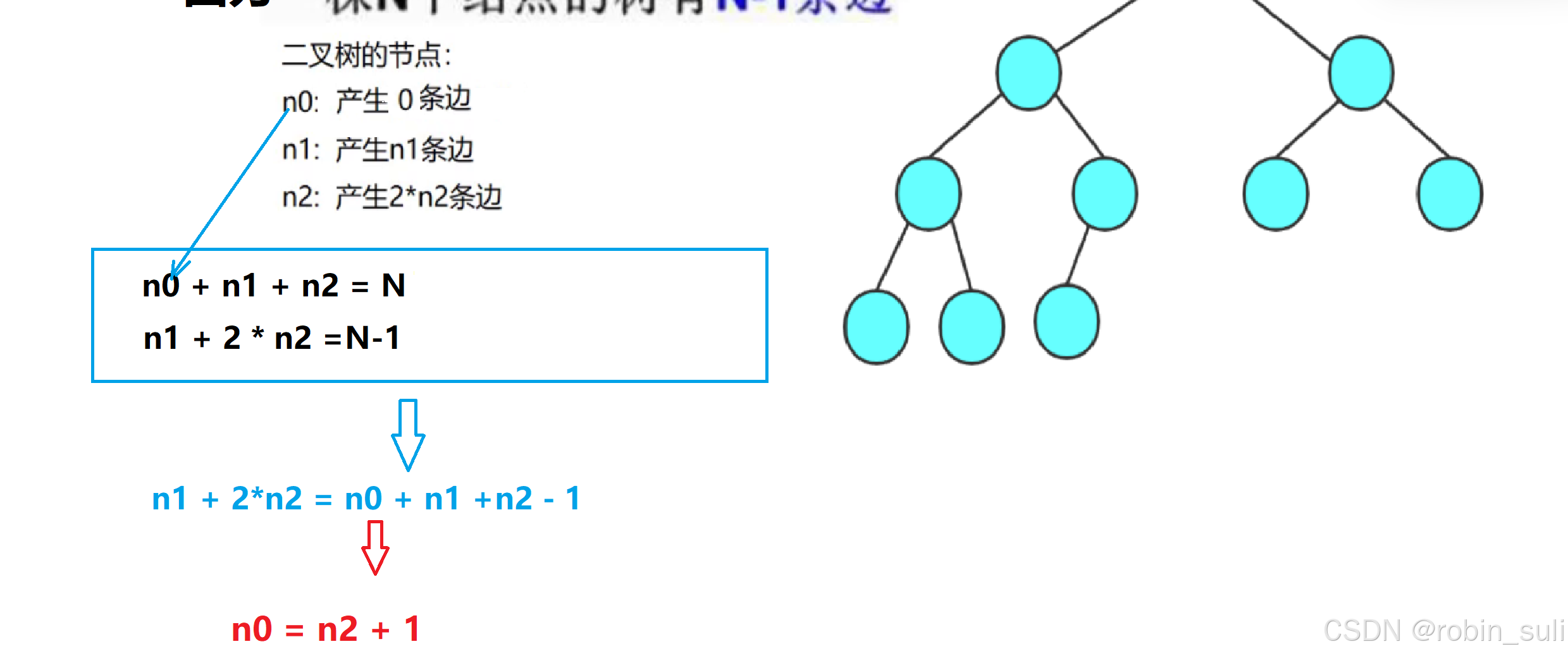 (3). 对任何一棵二叉树, 如果其叶结点个数为 n0, 度为2的非叶结点个数为 n2,则有n0=n2+1