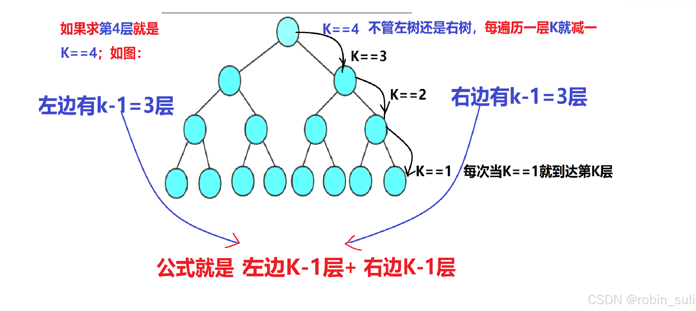 * 因为二叉树每遍历一层就会,往下走一层,就是k的值就 减一