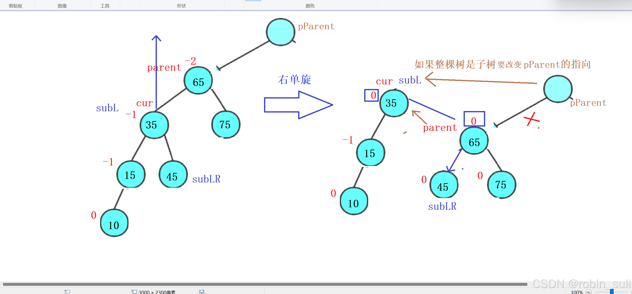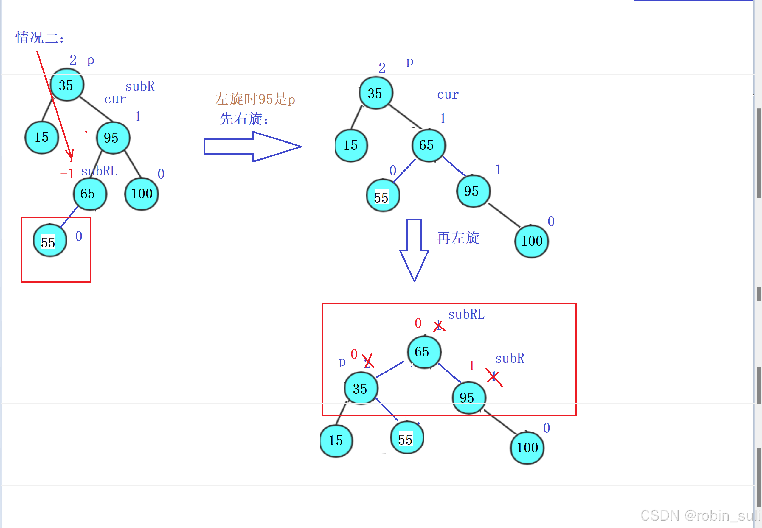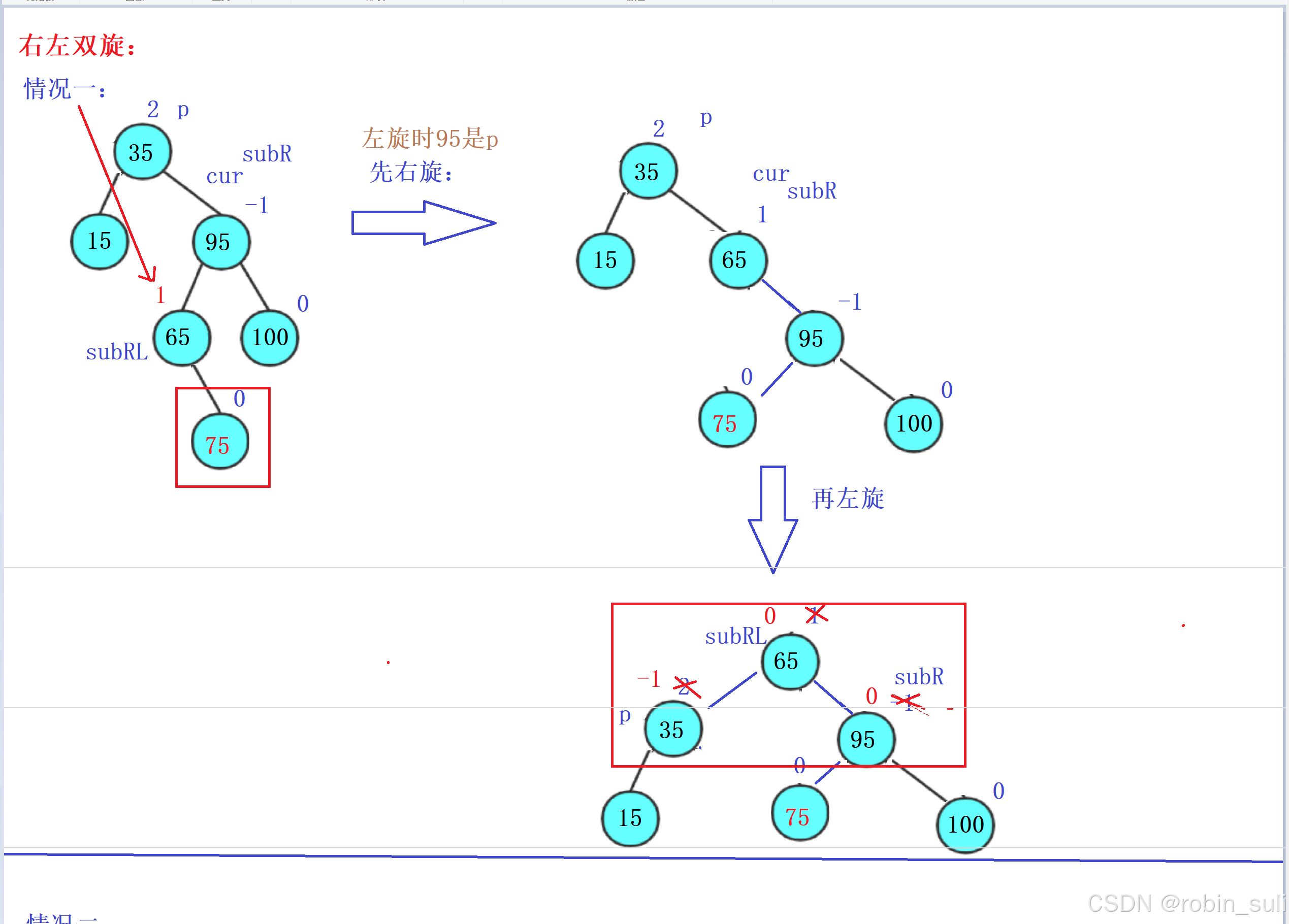 }4. Parent的平衡因子为 2,cur的平衡因子为-1 ,右左双旋(异号): 图解: 情况一:subRL平衡因子等于1