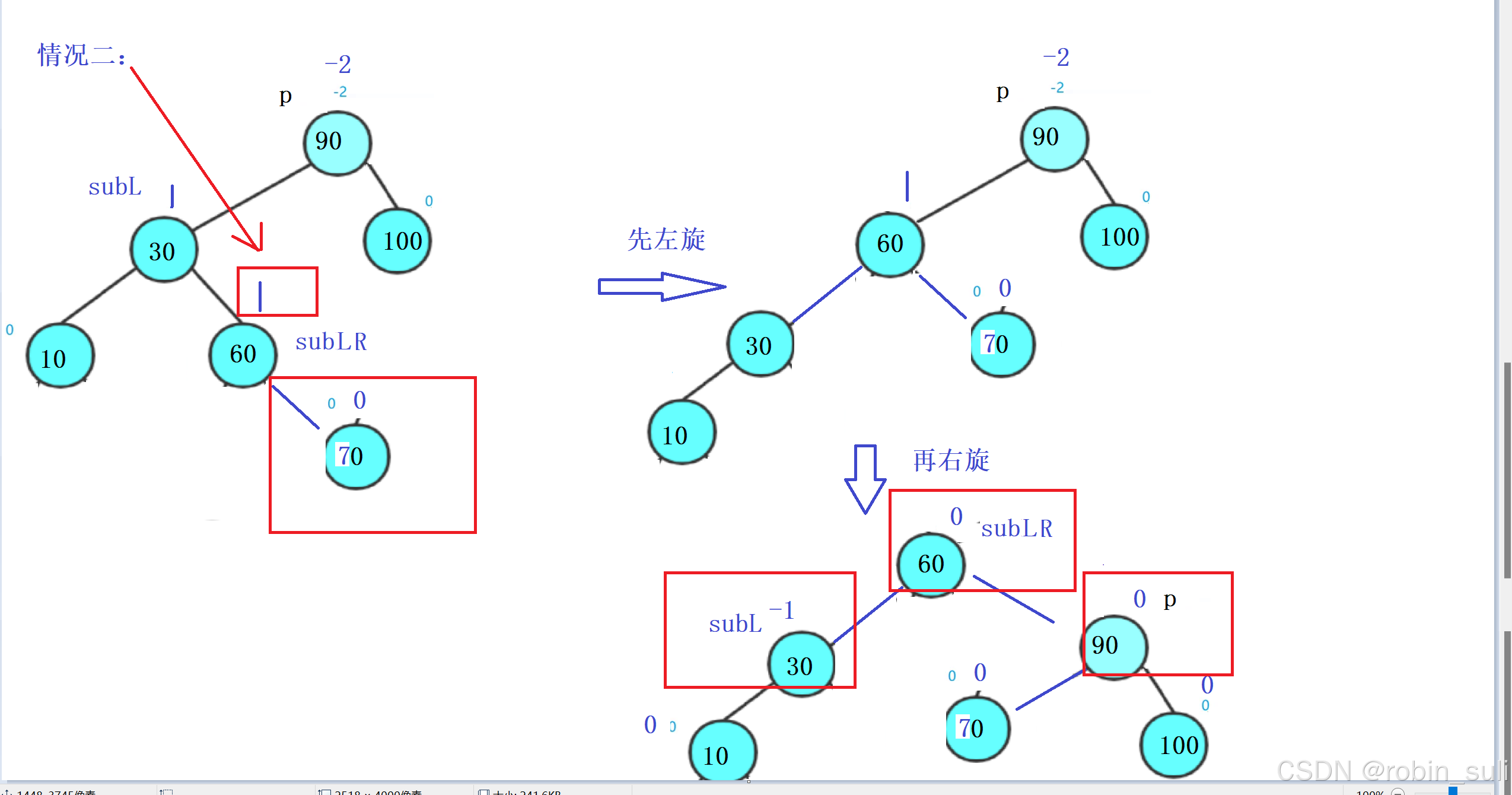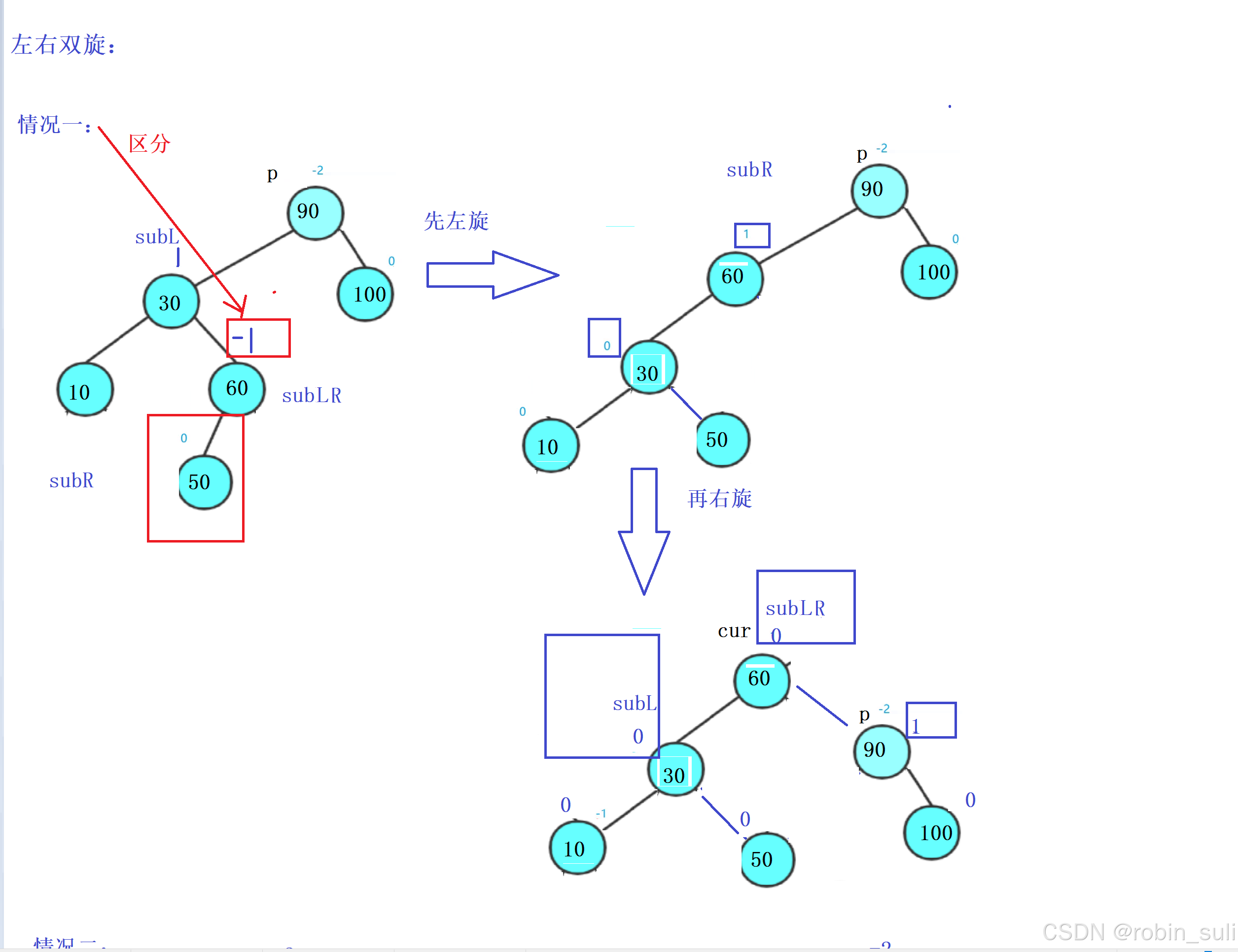 }3.3. Parent的平衡因子为 -2,cur的平衡因子为 1 , 左右双旋(异号): 图解:subLR的平衡因子区分情况 情况一:subLR平衡因子等于-1