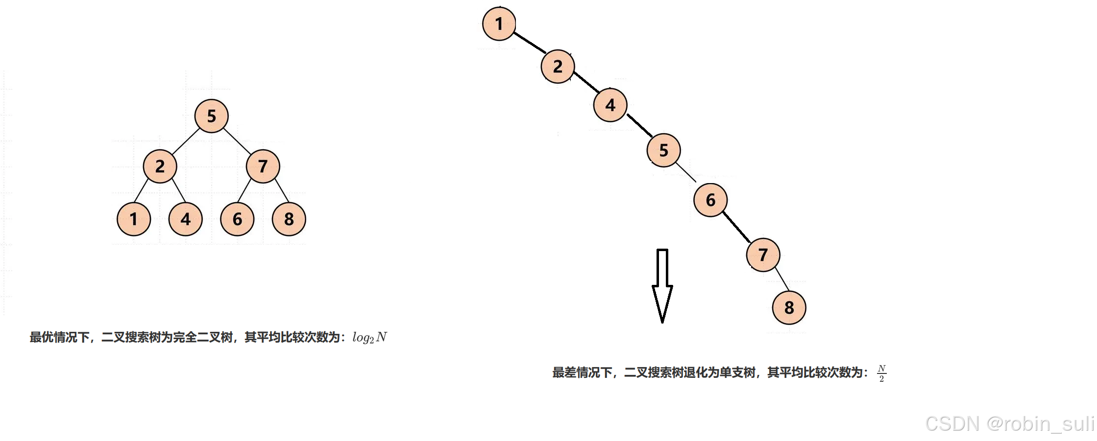 二叉树查询性能分析: 插入和删除操作都必须先查找,查找效率代表了二叉搜索树中各个操作的性能 对有n个结点的二叉搜索树,若每个元素查找的概率相等,则二叉搜索在二叉搜索树树平均查找长度是结点的深度的函数,即结点越深,则比较次数越多 如图: