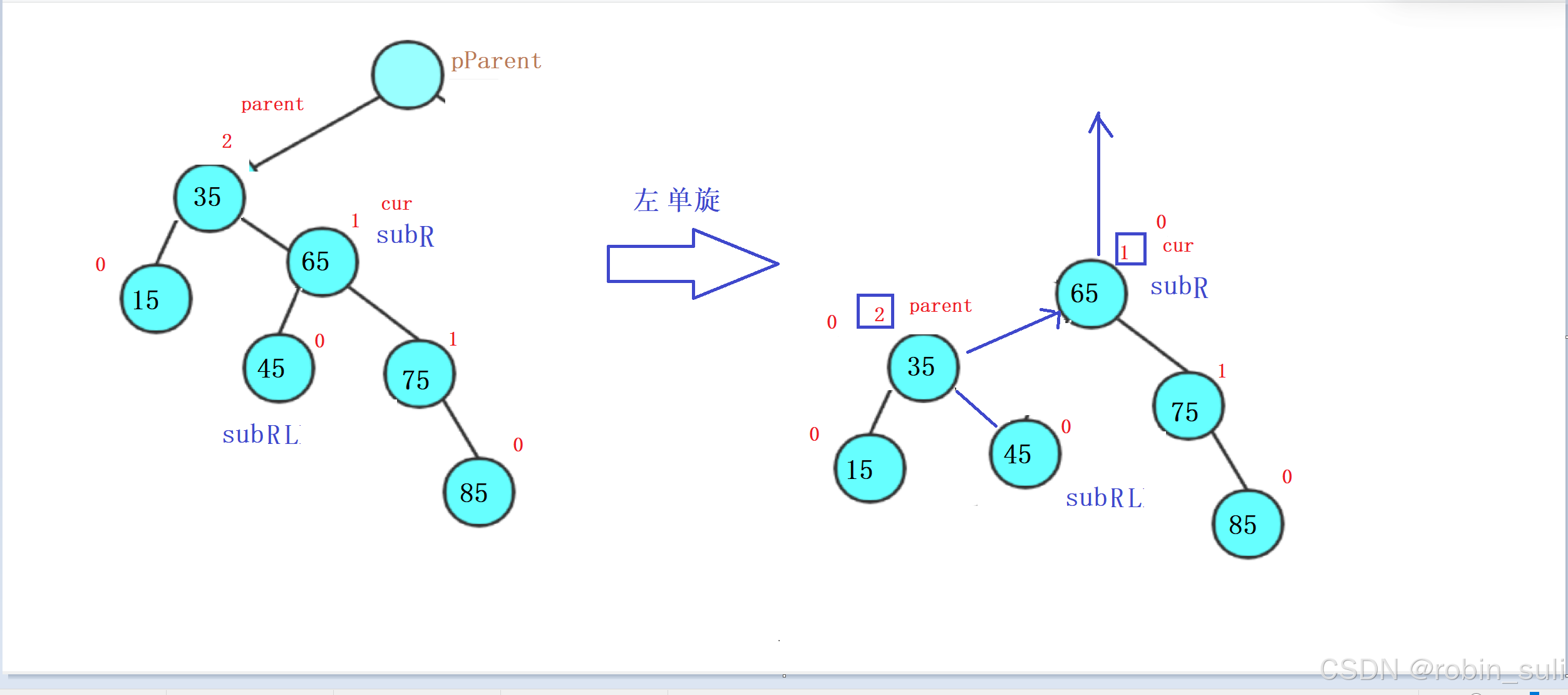 }3.2. 新节点插入较高右子树的右侧---左单旋: Parent的平衡因子为 2,cur的平衡因子为1 ,左单旋(同号) 图解: