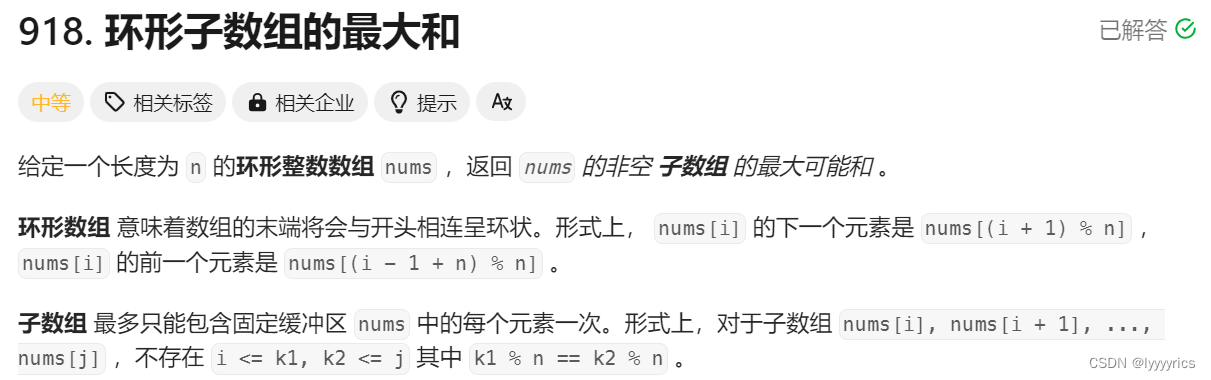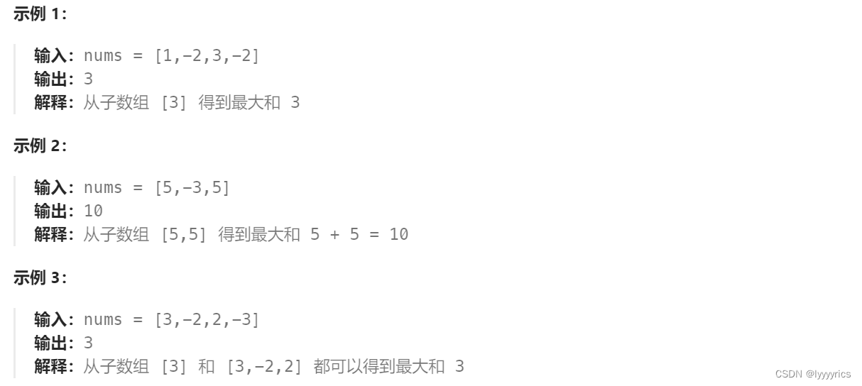 题目要求很简单,就是求出 最长的子数组的和,这个和有一个要求就是和最大。