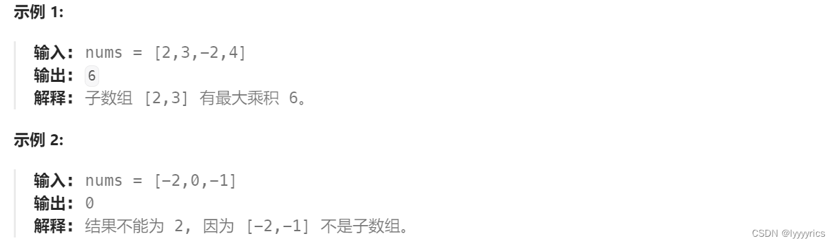 这道题的题意和前两道题也大差不差,就是让我们求最大乘积的子数组的乘积。 算法原理: 状态表示:这道题还是需要两个状态,因为有负数情况,不一定是正数乘正数才是最大的,两个负数相乘也 有可能是最大的。f[i]表示以i位置为结尾的子数组中的最大乘积的那个,g[i]表示以i位置为结尾的子数组中最小的乘积的那个。 状态转移方程:首先分析f[i]这个状态,这个状态有三个子状态,第一种状态是i位置是负数时,所以负数应乘上最小的才是最大的,还有一种状态就是当前位置是正数,所以当前位置应该乘上前一个位置中最大的那个子数组的乘积。还有一个情况就是单独成为一个子数组。