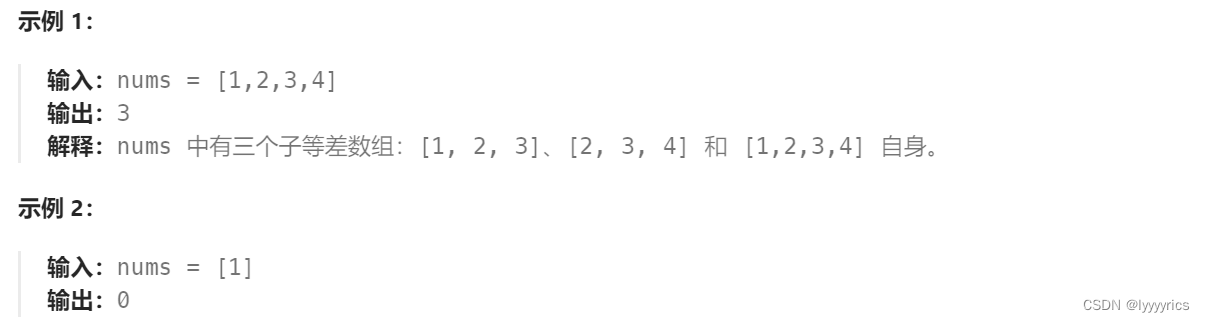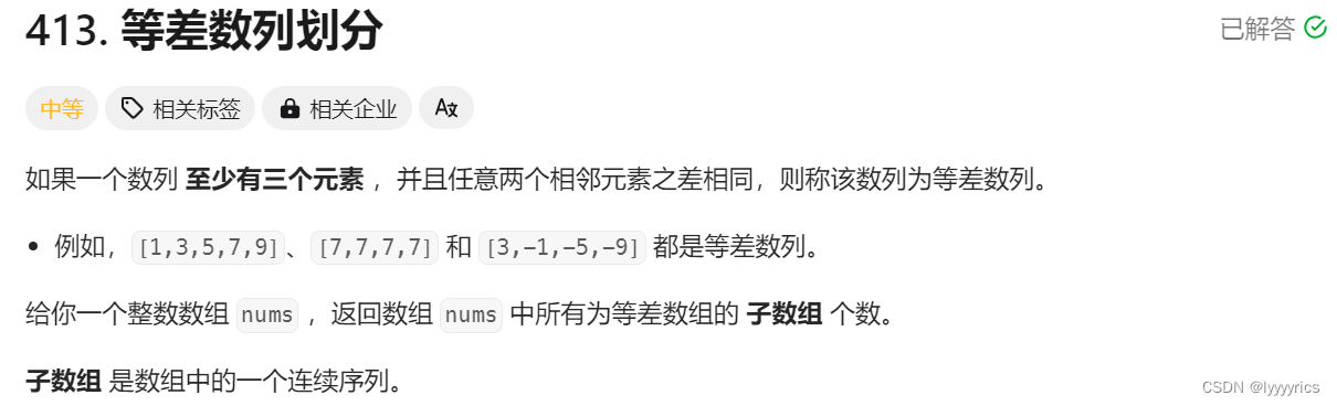 状态转移方程:先判断i位置的前两个位置是否 满足上述的等差数列的性质:如果满足则dp[i]=dp[i - 1] + 1