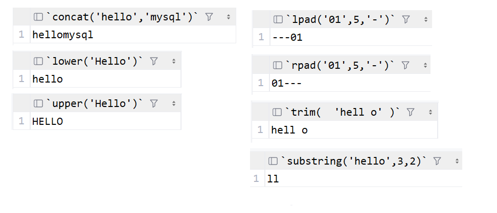 LPAD(str,n,pad) | 左填充,用字符串pad对str的左边进行填充,达到n个字符长度 |