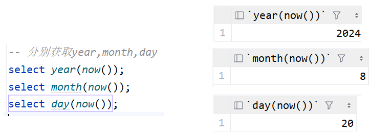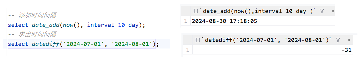 select datediff('2024-07-01', '2024-08-01');上面的10 day也可以换成其他的时间单位,例如year,minute等